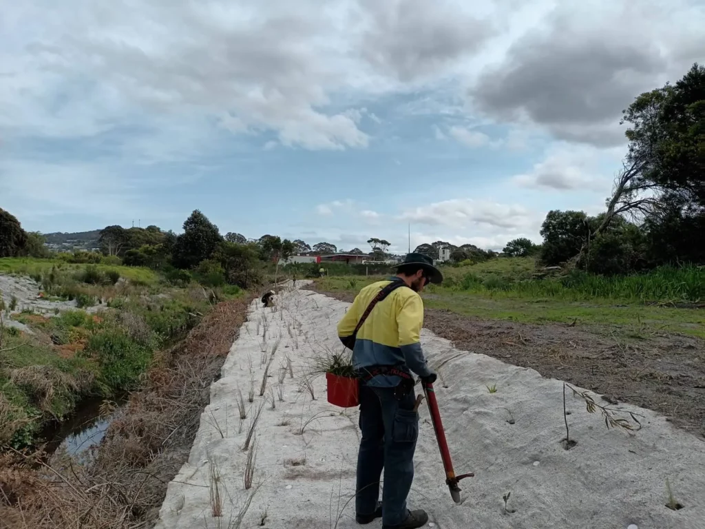 The staged works program at Yakanuphas involved bank recontouring, erosion control, weeding, and finally, revegetation. Once described as a ‘weed infested ditch’, the reach has been transformed into a potential environmental asset that promises to provide habitat, riparian connectivity, and numerous other features that will improve the ecological integrity of the creek.