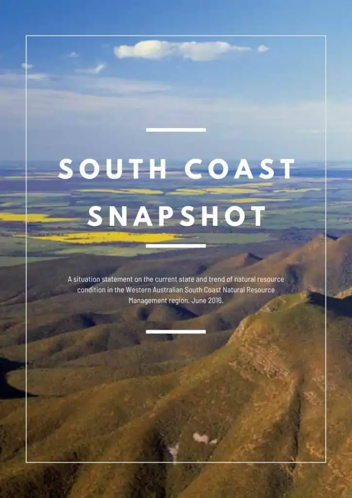 The South Coast Snapshot is a situation report on the state and trends of natural resource management across the South Coast Natural Resource Management region, as at June 2016. The report serves as a baseline for trends in natural resource management, and assists in understanding the present state of the environment, identifying gaps in knowledge and assisting to determine priorities for efficient use of limited funding.