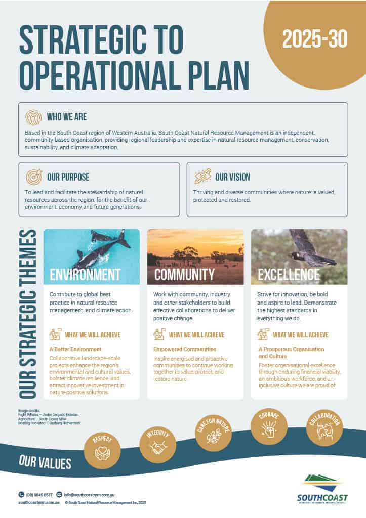 South Coast NRM’s vision is for thriving and diverse communities where nature is valued, protected and restored. South Coast NRM is committed to ensuring the region enjoys sustainable resources, unpolluted water and air, healthy soils, and unspoiled coastal and marine environments in an area rich in biodiversity and cultural heritage. As a registered, incorporated body, South Coast NRM releases annual reports to demonstrate operational successes and financial management throughout the year.